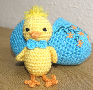 El huevo nº 5, en color amarillo y con margaritas bordadas. También la pareja del pollito de ayer.